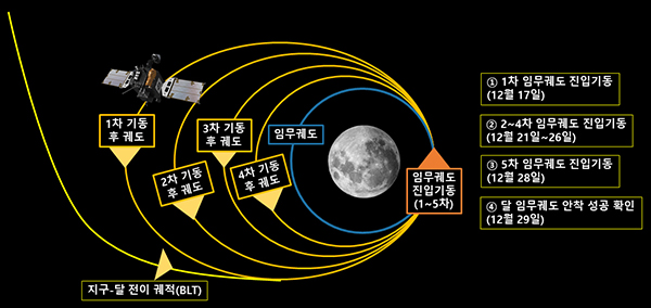 오는 17일에는 달에서 약 108km 거리까지 근접한다. 이날부터 28일까지 모두 5차례의 임무궤도 진입기동을 거쳐 달 상공 100km인 달 임무궤도에 안착할 예정이다.