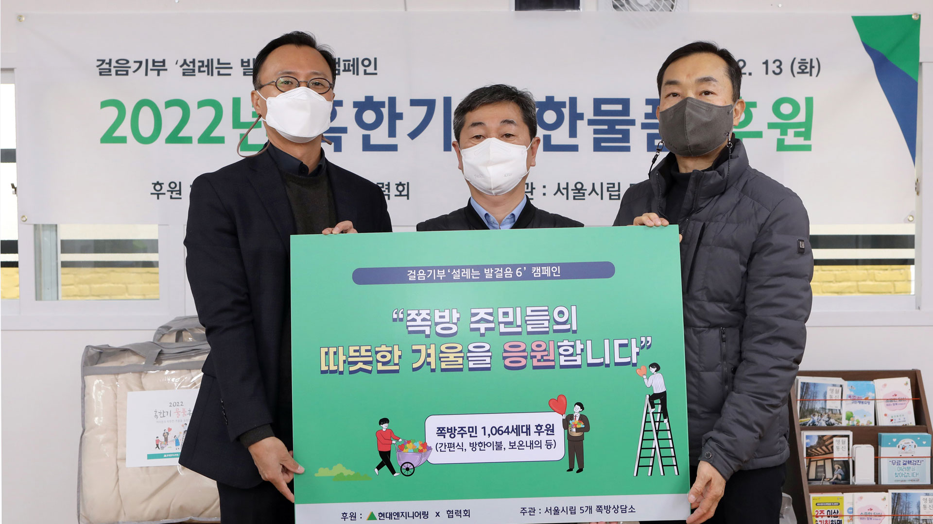 현대엔지니어링은 13일(화) 남대문쪽방상담소와 종로구청에서 서울시 5개 지역(남대문, 서울역, 영등포, 창신동, 돈의동) 쪽방주민 1,064세대와 종로구 주거취약계층 320세대에게 방한 물품과 식품류 등을 전달하는 ‘혹한기 대비 물품 전달식’을 진행했다.