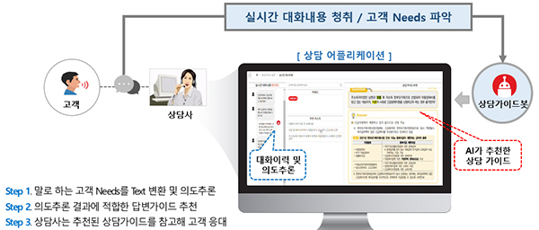 ’상담가이드 추천봇‘은 대화 내용이 채팅 형태로 변환돼 고객의 요구사항 파악이 용이하고 상담내용을 분석해 상담유형별 최적의 추천 답변을 검색할 수 있는 키워드를 추출해 제공한다.