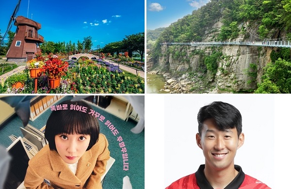 ▲ (사진 왼쪽부터 시계방향으로) 2022 한국관광의 별로 선정된 순천만국가정원, 한탄강 물윗길&주상절리길, 축구선수 손흥민, 드라마 이상한 변호사 우영우. [사진=문화체육관광부]