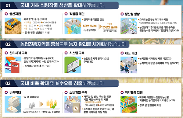 국내 기초 식량작물 생산을 확대하기 위해 전문 생산단지를 늘려 대규모·집중 생산체계를 구축한다.