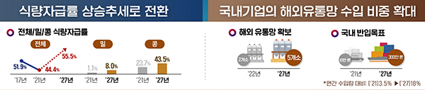 국내 기업의 해외 유통망 확보를 위한 지원방안을 마련해 곡물 수출 엘리베이터 등 해외 곡물 유통망을 현재 2곳에서 2027년까지 5곳으로 확대한다.