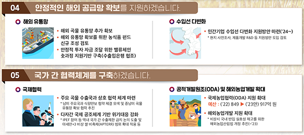 비상시 해외에서 확보한 곡물의 국내 반입 실효성 제고를 위해 해외농업·산림자원 개발협력법 개정도 추진한다.