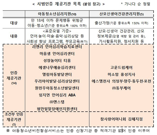 아동청소년심리지원 10곳·산모신생아건강관리지원 4곳...3년간 유효