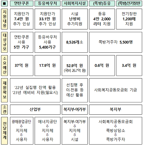 정부는 우선 연탄쿠폰과 등유바우처 지원확대를 통해 기존에 지원받던 5만 5400가구에 대해 추가로 54억 9000만 원을 한시적으로 긴급 추가 지원한다.