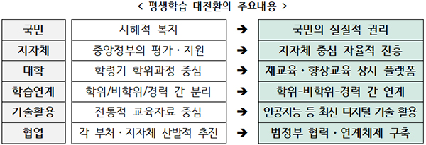 교육부는 그간 시혜적 복지로 인식되던 평생학습을 국민의 시각에서 실질적인 권리로 보장하는 데 주력하는 한편, 지자체·대학 중심의 평생학습 정책을 확대·강화하고 사회부총리 차원에서 평생학습을 위한 국가-지자체-민간 협력체계를 구축한다.