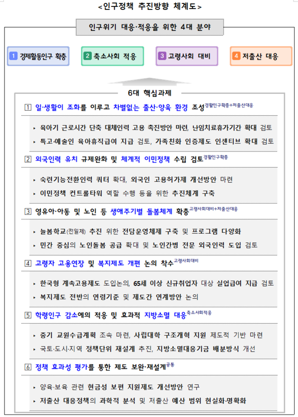 위원회는 지난 6월 새정부의 경제정책방향에 담긴 ▲경제활동인구 확충 ▲축소사회 적응 ▲고령사회 대비 ▲저출산 대응 등 4대 분야를 중심으로 6대 핵심과제를 선정, 관련 정책을 집중적으로 추진할 계획이다.