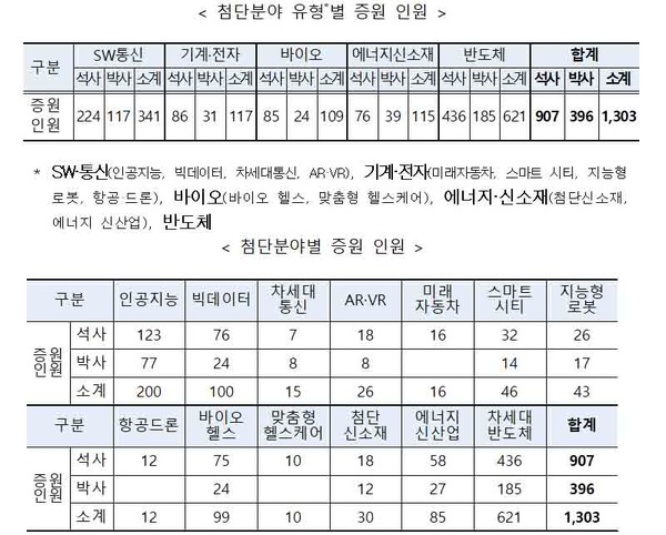 24개 대학, 69개 학과(전공)의 첨단분야 석·박사 정원 증원 인원은 1303명(석사 907명·박사 396명)으로 소프트웨어(SW)·통신 341명, 기계·전자 117명, 생명(바이오) 109명, 에너지·신소재 115명, 반도체 621명이다.