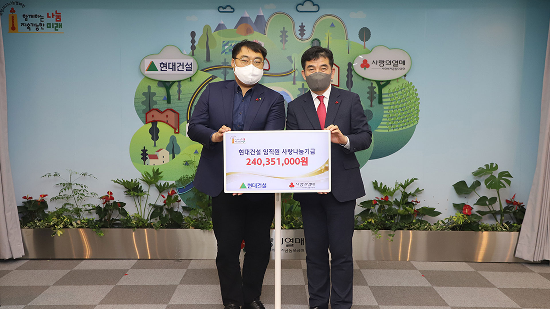 현대건설 임직원은 사회복지공동모금회에 1년간 급여 모금으로 모아온 ‘사랑나눔기금’ 약 2억 4천여만원을 기탁했다고 밝혔다.
