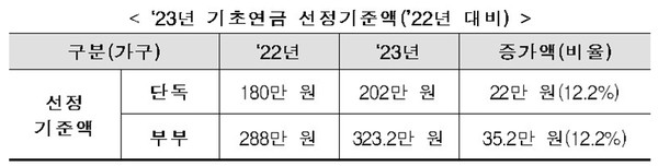 보건복지부는 2023년도 기초연금 선정기준액을 단독가구 202만 원과 부부가구 323만 2000원으로, 지난해 대비 12.2% 인상한다고 밝혔다.