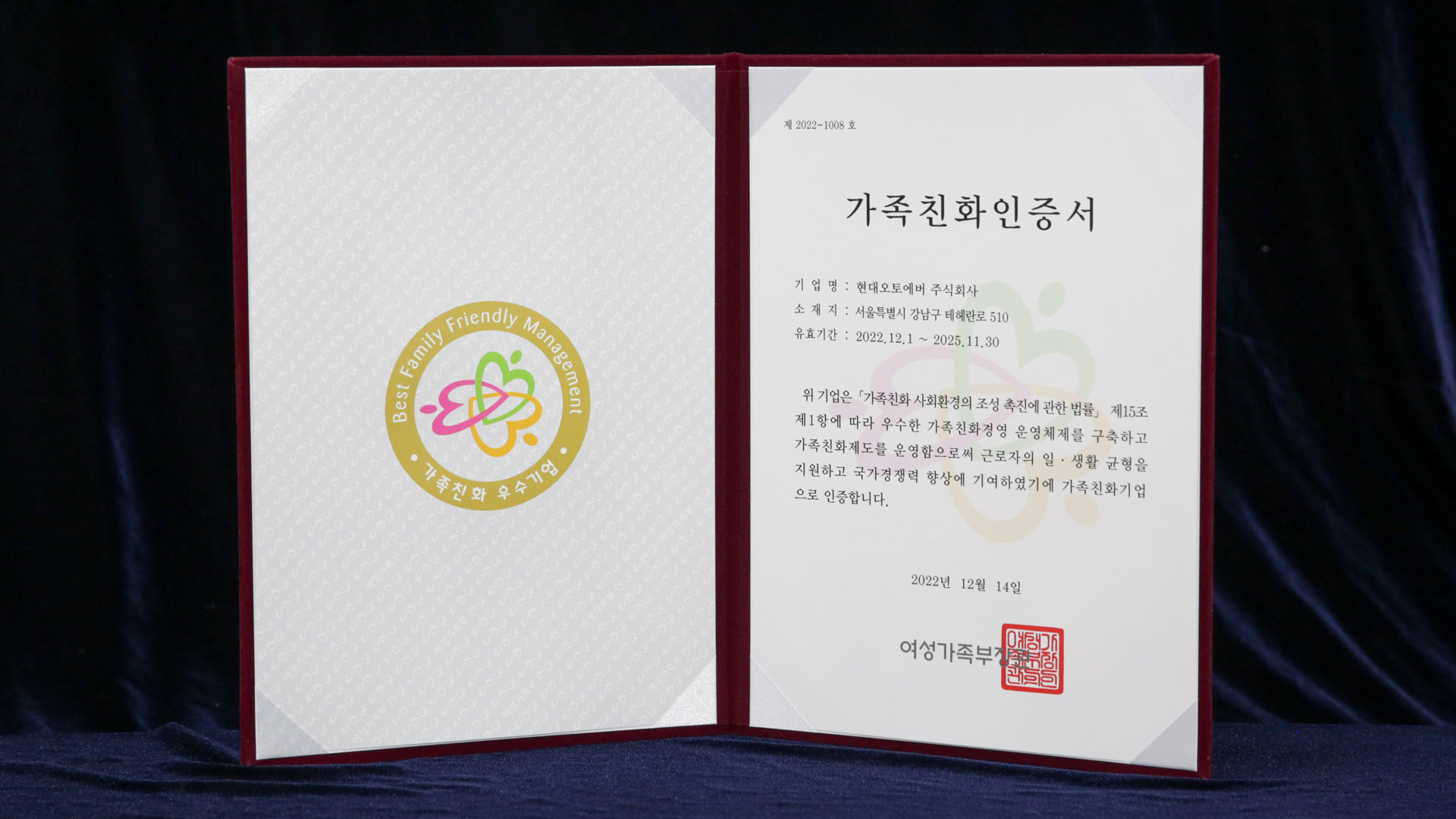 이번 인증은 현대오토에버가 2014년 첫 인증을 받은 이후 2019년 재인증에 이은 세 번째 인증이다. 현대오토에버가 일과 가정의 양립을 위해 마련한 다양한 제도가 높은 평가를 받은 것이다. 현대오토에버는 유연근무제, 가족돌봄휴가, EAP (Employee Assistance Program) 지원 등 가족친화적인 근무 환경 조성에 많은 노력을 기울이고 있다.