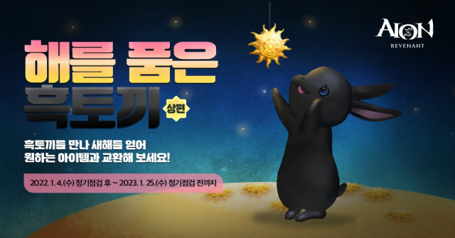 클래식 서버 이용자는 1월 25일 정기점검 전까지 ‘해를 품은 흑토끼’ 이벤트에 참여할 수 있다. 특정 장소에 등장하는 ‘흑토끼’를 처치하거나 관련 퀘스트를 완료하면 이벤트 주화 ‘흑토끼가 품은 새해’를 얻는다. 주화는 ‘흑토끼 외형’, ‘백금 공훈 훈장 조각 꾸러미’, ‘60레벨 희귀 마석 선택 꾸러미’ 등의 아이템과 교환할 수 있다.