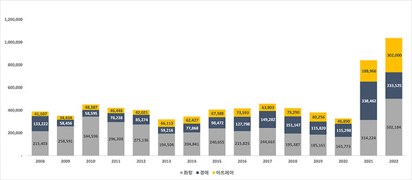 화랑을 통한 판매액 역시 2021년 3142억 원에서 지난해 5022억 원으로 1880억 원 증가한 것으로 추정했다.