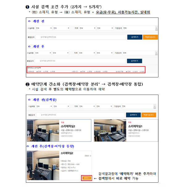 국민들이 예약 시 보다 쉽게 검색하고 예약할 수 있도록 기존 검색조건 외에 요금·시간·실내외의 3가지 검색조건을 추가하고 예약화면 디자인 등을 개편했다.