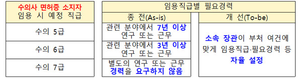 이전에는 수의사 면허 소지자를 5급에 임용하려면 7년 이상, 6급은 3년 이상의 관련 분야 경력을 요구하는 등 공무원임용시험령에서 일정한 기준을 정하고 임용 부처는 이를 따라야 했다.