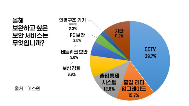 ‘올해 보완하고 싶은 보안 서비스는 무엇인가’라는 질문에는 △네트워크 보안(5.8%), △PC보안(3.6%) 등 정보보안을 선택한 응답자가 9.4%에 그친 반면 △CCTV(39.7%) △출입관리 솔루션(28.5%) 등 물리보안을 선택한 응답자가 전체의 79.4%에 달했다.