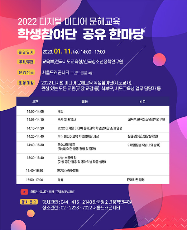 이번 성과공유 한마당은 디지털 미디어 문해력 함양 활동을 수행한 학생참여단 각 팀별 활동 경험과 성과를 나누기 위해 마련됐다.