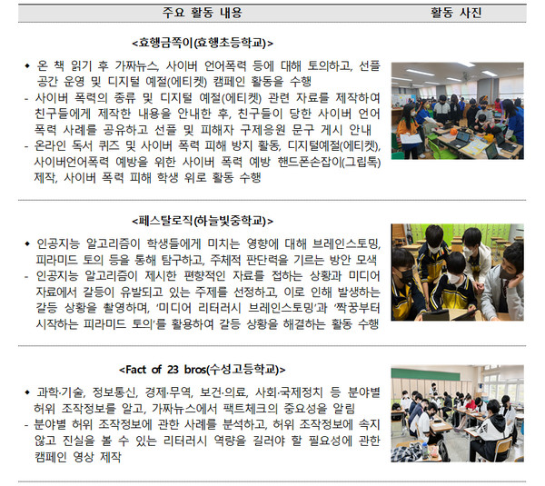 이중 ▲가짜뉴스, 사이버 언어폭력 등에 대해 토의하고 디지털 예절(에티켓) 캠페인 활동을 수행한 ‘효행금쪽이(효행초)’ ▲디지털 이해력(리터러시) 브레인스토밍으로 유튜브 알고리즘을 탐구한 ‘페스탈로직(하늘빛중)’ ▲분야별 허위 조작 정보를 탐구해 가짜뉴스에서 사실확인(팩트체크)의 중요성을 알린 ‘Fact of 23 bros(수성고)’등 3개 팀은 부총리 겸 교육부장관상을 수상했다.