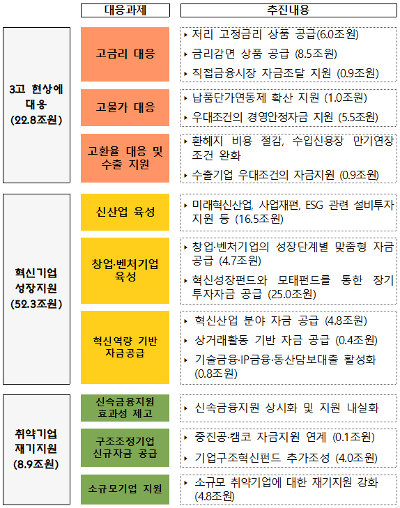 우선 중기부와 금융위는 3고 현상에 의한 비용부담 대응 등에 22조 8000억원을 투입한다.