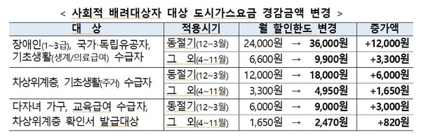 이번 개정으로 장애인(1~3급), 국가·독립유공자, 기초생활(생계/의료급여) 수급자의 동절기(12~3월) 월 할인 한도를 현재 2만 4000원에서 3만 6000원으로 확대한다.