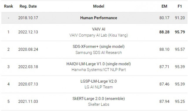바이브컴퍼니(이하 바이브)의 인공지능(AI) 언어 모델이 한국어 기계 독해(Machine Reading Comprehension, MRC) 데이터셋인 ‘코쿼드(KorQuAD, Korean Question Answering Dataset) 1.0’ 기반 성능 평가에서 1위를 차지했다고 13일 밝혔다.