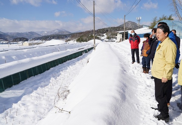 남성현 산림청장이 지난해 12월 25일 폭설이 내린 전북 순창군 사과대추 비가림시설 재배 임가를 방문해 관계자들과 피해 상황을 점검하고 있다. [사진=산림청]