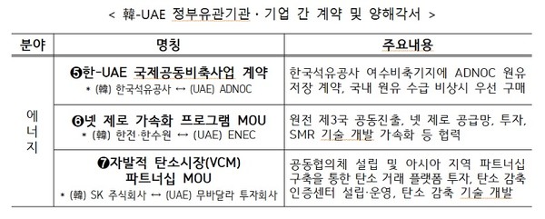 산업통상자원부 및 에너지와 산업분야 유관기관·기업들은 15일(현지시간) 윤석열 대통령의 UAE 순방 계기 UAE 측과 총 7건(산업 1건, 에너지 5건, 무역·투자 1건)의 공동성명, 양해각서 또는 계약을 체결했다고 산업부가 밝혔다.
