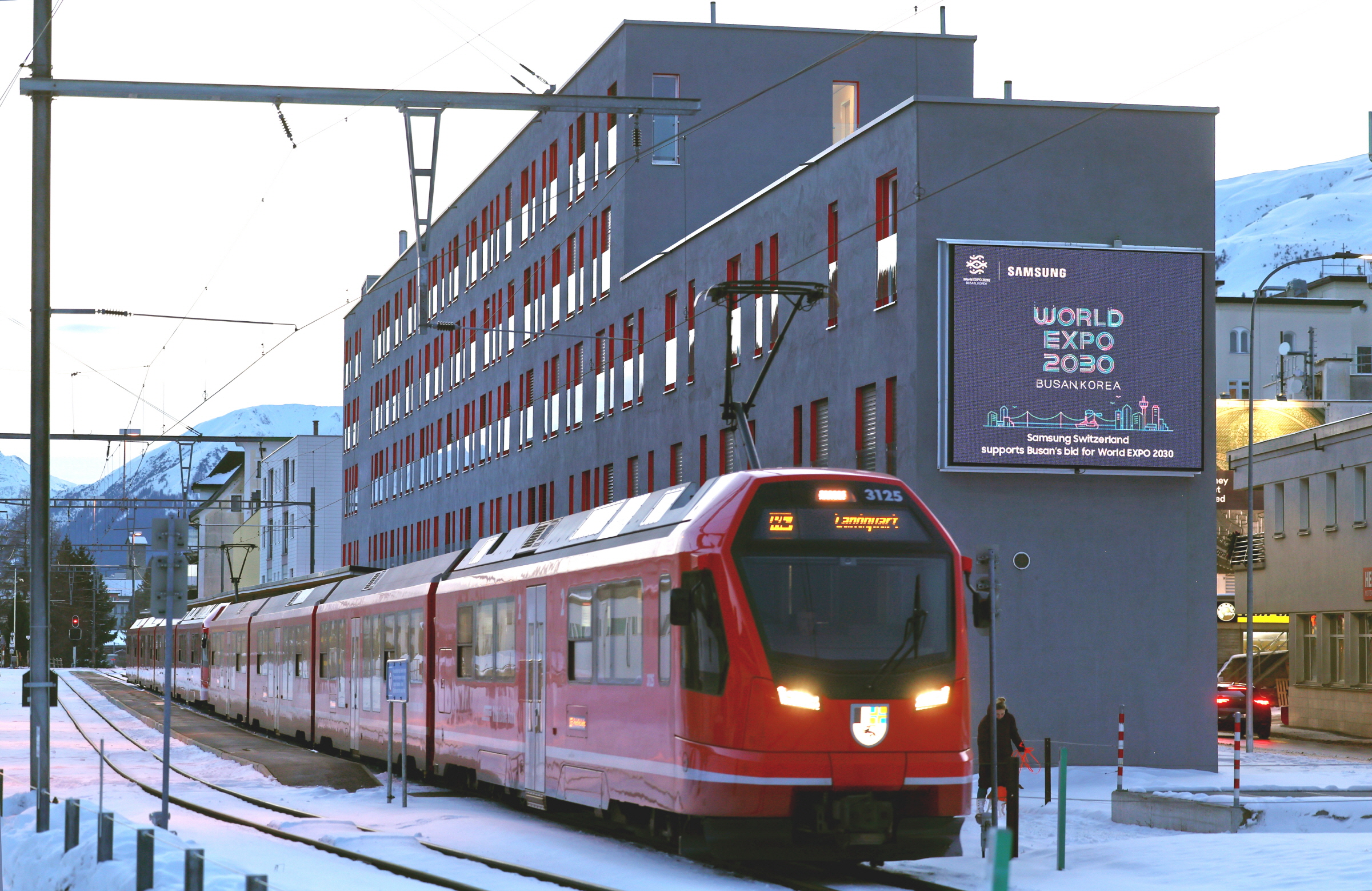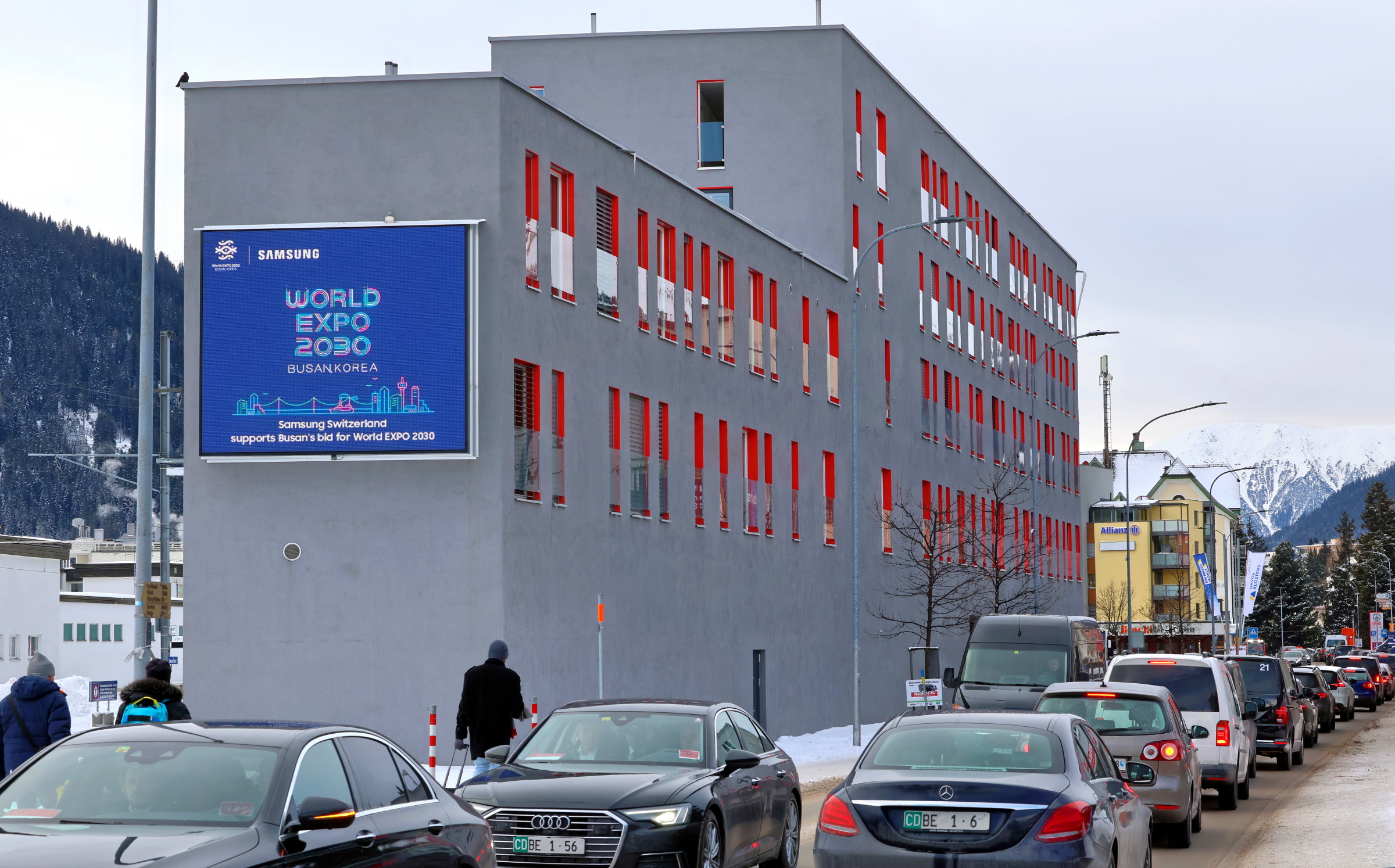 삼성전자는 다보스의 중심가인 반호프슈트라세(Bahnhofstrasse)에서 부산엑스포 응원 메시지를 담은 대형 디지털 옥외광고를 선보이고 있다.