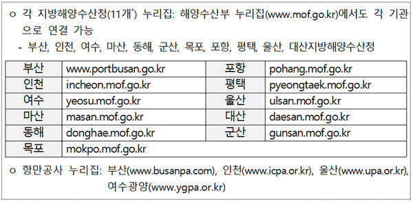 이 밖에도 도움을 받을 수 있는 항만운영 관련 업체의 연락처를 각 지방해양수산청과 항만공사 누리집에 게시한다.