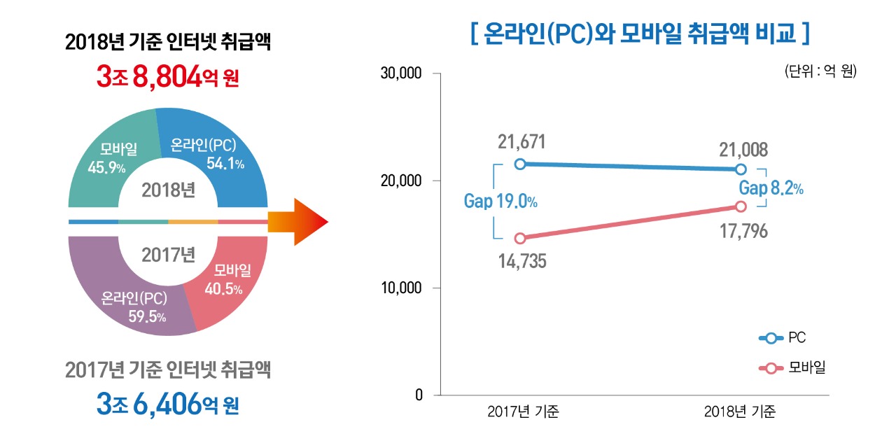 인터넷 매체 취급액은 3조 8,804억 원(35.1%)으로 매해 지속적으로 증가하고 있는 것으로 나타났다. 특히, 전년 대비 모바일 취급액(1조 4,735억 원 → 1조 7,796억 원) 증가율이 20.8%에 달해 인터넷 광고시장의 성장세를 이끌었다.