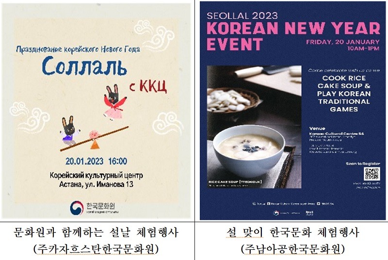 주헝가리한국문화원과 주러시아한국문화원은 현지 학교를 방문해 학생들을 대상으로 전통놀이 등 설날 체험행사, 주독일한국문화원과 주이탈리아한국문화원, 주스페인한국문화원은 언론과 한국문화 관심층을 대상으로 설 명절을 소개하는 행사를 개최할 예정이다.