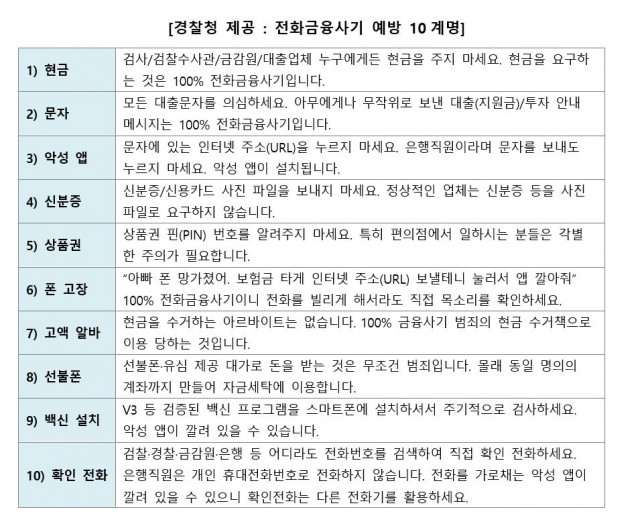 경찰청은 이러한 보이스피싱, 스팸·스미싱 피해를 예방하기 위한 10계명을 만들어 사전에 사기 피해를 차단하기 위한 대응법을 공유했다.