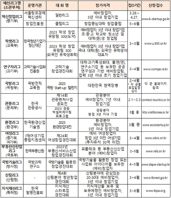 ‘도전! K-스타트업 2023’ 참여를 희망하는 (예비)창업자는 K-스타트업 누리집에 게시된 통합 공고문과 예선리그 운영 부처별 세부 모집공고를 확인해 예선리그별 접수기간에 맞춰 신청하면 된다.