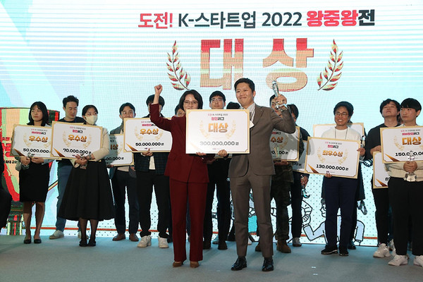 이영 중소벤처기업부 장관이 지난해 11월 24일 서울 중구 동대문디자인플라자(DDP)에서 열린 ‘도전 K-스타트업 2022 왕중왕전’ 시상식에서 (주)엘디카본에 창업기업리그 대상인 대통령상을 수여하고 기념촬영을 하고 있다. [사진=중소벤처기업부]
