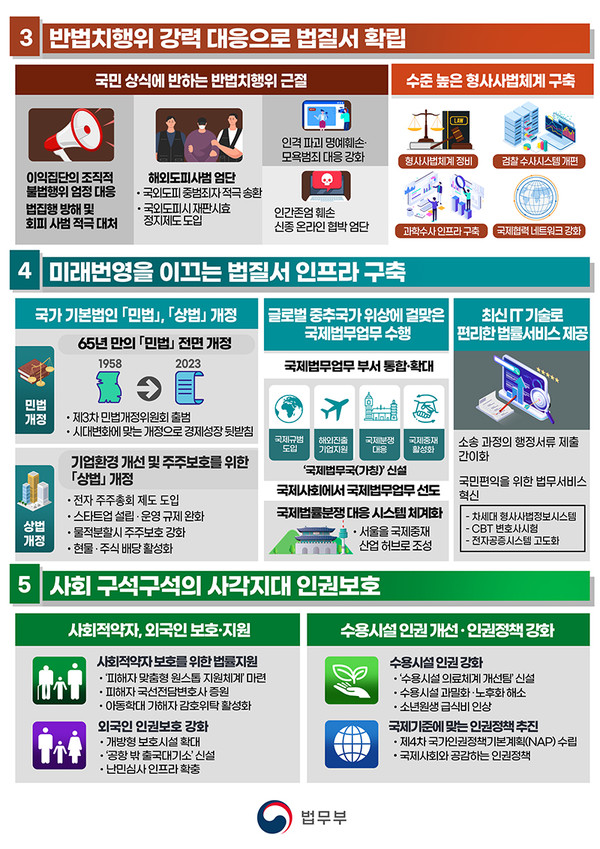 법무부는 ▲범죄로부터 안전한 나라 실현 ▲새롭게 만들어가는 출입국·이민 정책 ▲반법치행위 강력 대응으로 법질서 확립 ▲미래번영을 이끄는 법질서 인프라 구축 ▲사회 구석구석의 사각지대 인권보호 등 5대 핵심 추진과제를 통해 미래번영을 뒷받침하는 글로벌 선진 법치를 실현해 나간다.