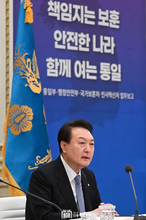윤석열 대통령이 27일 청와대 영빈관에서 열린 통일부·행정안전부·국가보훈처·인사혁신처 업무보고에서 발언하고 있다. [사진=대통령실]