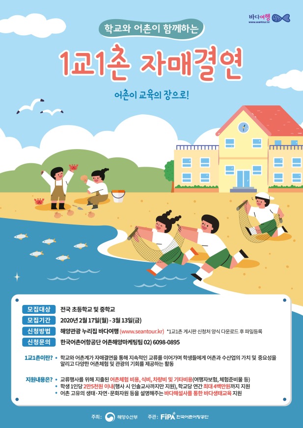 해양수산부와 한국어촌어항공단은 2월 17일(월)부터 3월 13일(금)까지 학교와 어촌 간 교류를 활성화하기 위한 '1교1촌 자매결연 지원사업‘의 대상학교를 공모한다.