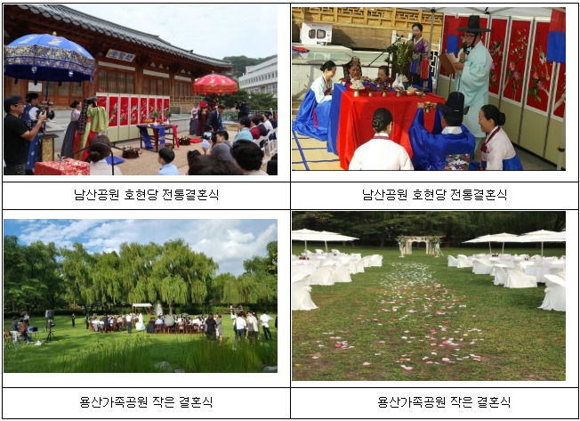 중부공원녹지사업소는 올해도 예식에 대한 비용절감과 환경까지 생각하는 <공원 내 작은 결혼식>을 ▲남산공원 호현당 ▲용산가족공원 잔디광장에서 4월~10월까지(7월~8월 제외) 매주 주말과 공휴일에 진행한다고 밝히며, 예비부부의 결혼식 장소 신청을 받는다고 전했다.
