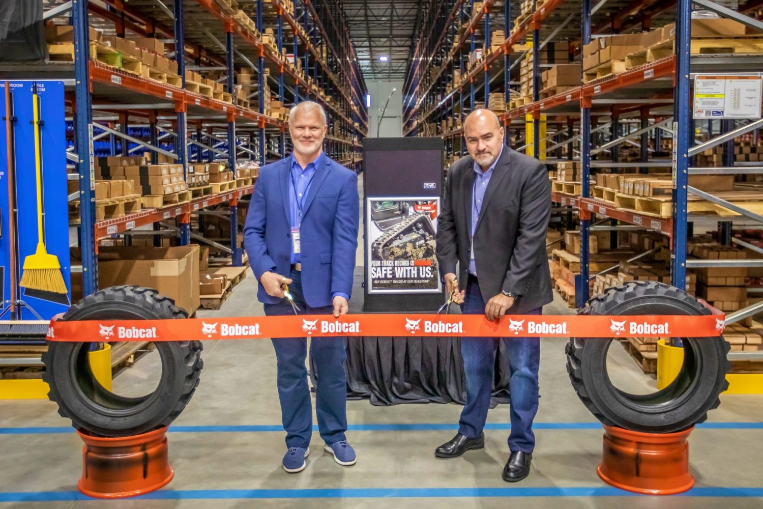 마이크 볼웨버(Mike Ballweber) 두산밥캣 북미 법인장(왼쪽)과 부품센터를 관리하는 APL 로지스틱스의 파비오 두케(Fabio Duque) 부사장이 애틀랜타 센터 오픈을 기념하며 리본 커팅을 하고 있다.