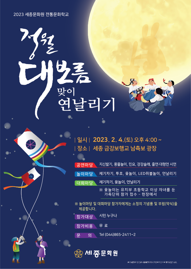 세종특별자치시가 정월대보름을 맞이해 오는 2월 4일 이응다리 일대에서 ‘2023년 정월대보름 맞이 전통문화 체험행사’를 개최한다.
