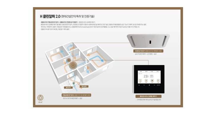 또한 현대건설은 전열교환 환기장비 및 천장형 공기청정기를 연계한 하드웨어 장치, 광플라즈마 기술을 활용한 살균장치, 실내외 공기질을 측정하여 상황에 맞도록 자동으로 운전하는 센서 유닛 일체형 제어기 등도 통합하여 개발했다.