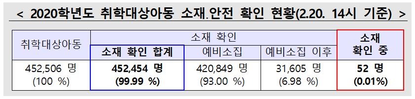교육부(부총리 겸 교육부장관 유은혜)와 경찰청(청장 민갑룡)은 예비소집 단계부터 교육청, 지자체 등과 협력하여 취학대상아동의 99.99%인 452,454명의 소재와 안전을 확인하였으며, 아직 확인되지 않은 아동 52명에 대해서는 관계 기관과 유기적으로 연계하여 소재를 끝까지 확인할 예정이다.