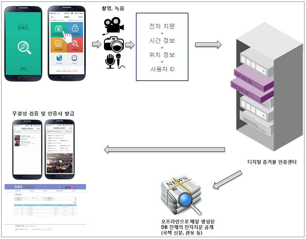 ‘디지털 인증 서비스(DAS)’는 수사 현장에서 수사관이 스마트폰 전용앱으로 동영상·음성·사진을 촬영해 해당 파일의 주요정보를 국립과학수사연구원 내 인증 서버로 실시간으로 전송하고, 수사관과 국과수 인증 서버에 해당 파일의 인증정보를 공유하는 시스템이다.