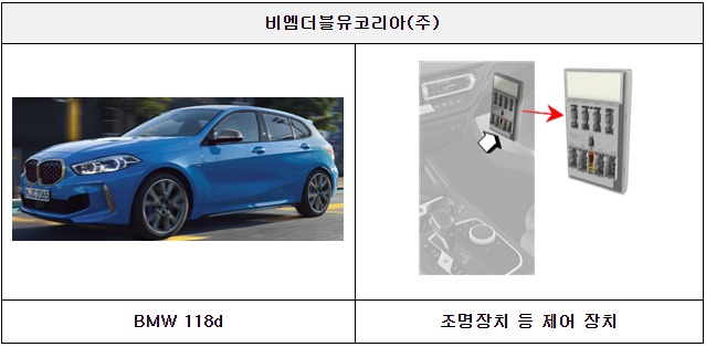 셋째, 비엠더블유코리아㈜에서 수입, 판매(판매 이전 포함)한 BMW 118d 321대는 차량 실내·외 조명장치 등을 제어하는 소프트웨어의 오류로 계기판에 후미등 및 차폭등 작동 여부 표시등이 점등되지 않을 가능성이 확인되어 시정조치(리콜)에 들어간다.