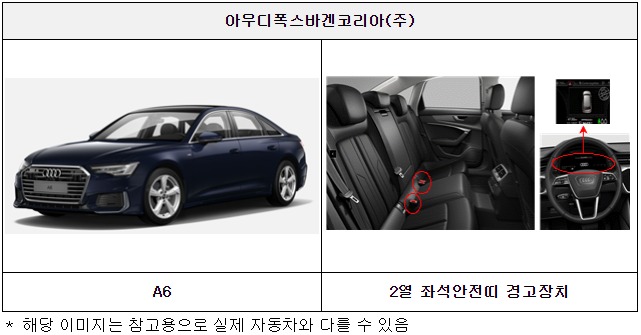 넷째, 아우디폭스바겐코리아㈜에서 수입, 판매(판매 이전 포함)한 A6 40 TDI 등 11개 차종 10,764대와 한불모터스㈜에서 수입, 판매(판매 이전 포함)한 DS3 Crossback 1.5 Blue HDi 78대는 2열 좌석안전띠 경고장치가 자동차 안전기준에 부적합하여 시정조치(리콜)에 들어간다.