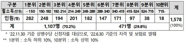 신청자의 소득 분포를 살펴보면 직장가입자의 소득 하위 50%가 전체의 70.2%를 차지하고 있었다. 100인 미만 사업장 근로자는 69.2%로, 소득 하위 50%와 소규모사업장 근로자의 신청 비율이 높았다.