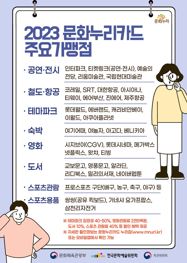 문화누리카드는 전국 2만 7000여 개의 문화예술, 국내 여행, 체육 분야 가맹점에서 이용할 수 있다.