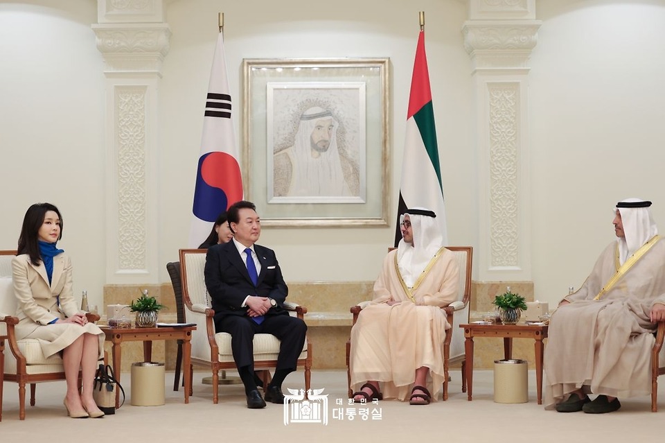 1월 15(현지시간) 아부다비에서 열린 한국과 UAE간 양국 정상회담에서 윤석열 대통령은 확대회담 및 양해각서 서명식을 가졌다. [사진=대통령실]
