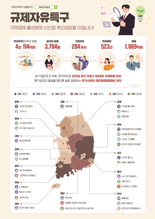 그동안 비수도권 14개 시도에 32개 특구가 지정됐으며 이들 특구에서 추진된 80개 사업 중 8개 사업이 현장 실증과 임시허가 과정을 거쳐 규제법령 17건의 정비를 완료하고 종료됐다.