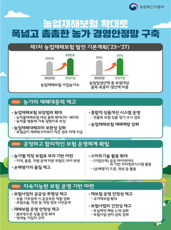 농림축산식품부는 이 같은 내용을 포함한 ‘제1차 농업재해보험 발전 기본계획(2023∼2027)’을 31일 발표했다.